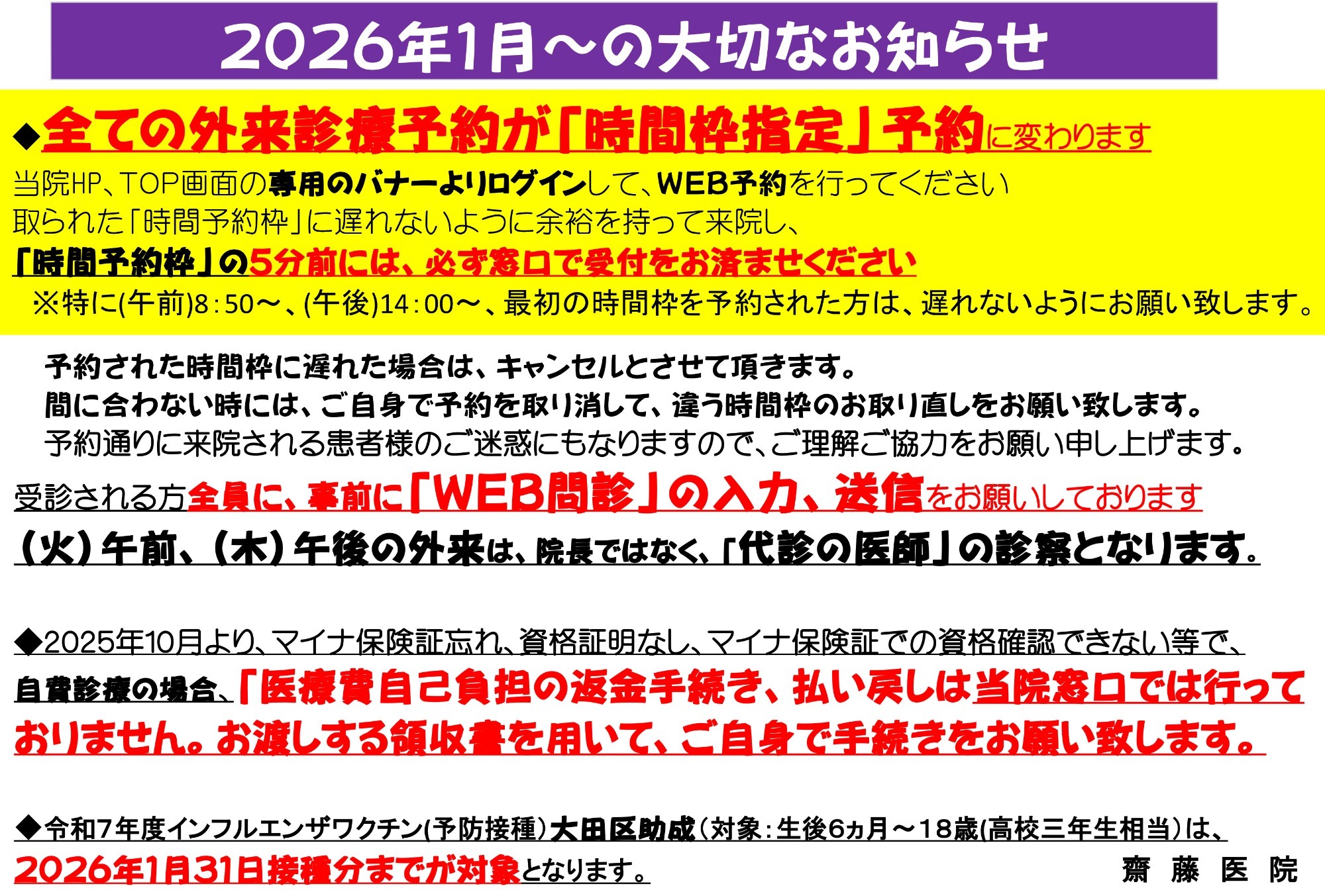 火曜午後と木曜午前は完全予約制の健康な赤ちゃんの予防接種・乳児健診のみとなり一般診療は休診となります