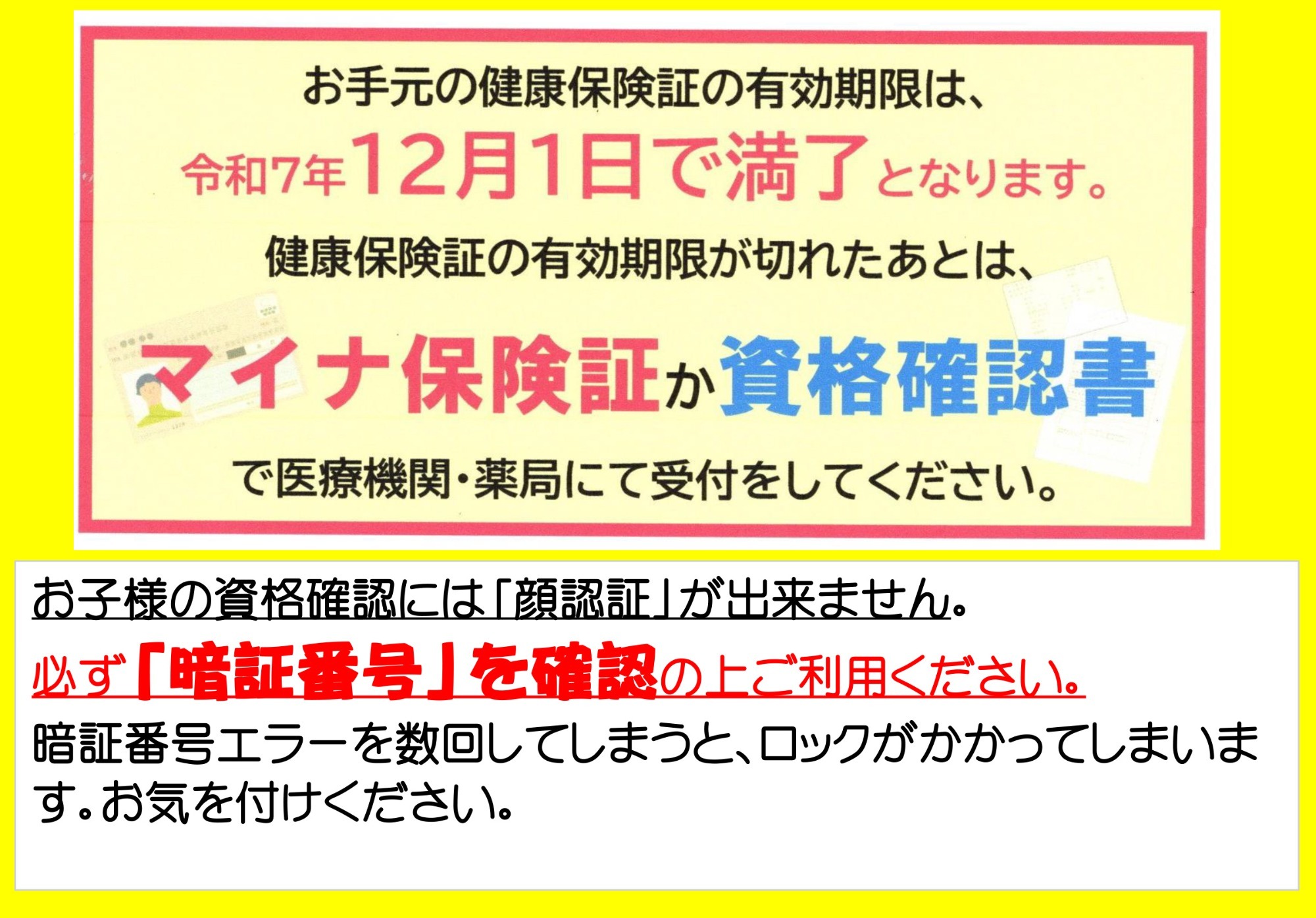 「マイナ保険証」ご利用の際は「顔認証」出来ない事がありますので、事前に必ず「暗証番号」を確認の上、来院してください。