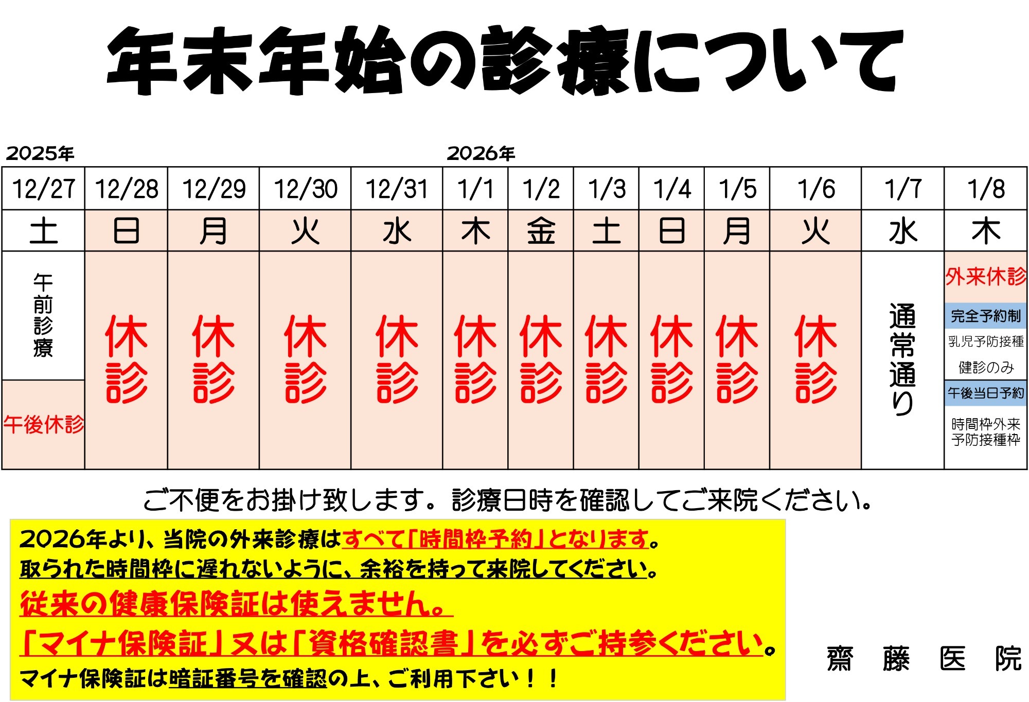 12月27日(土)午後から1月6日(火)まで休診とさせていただきます。
